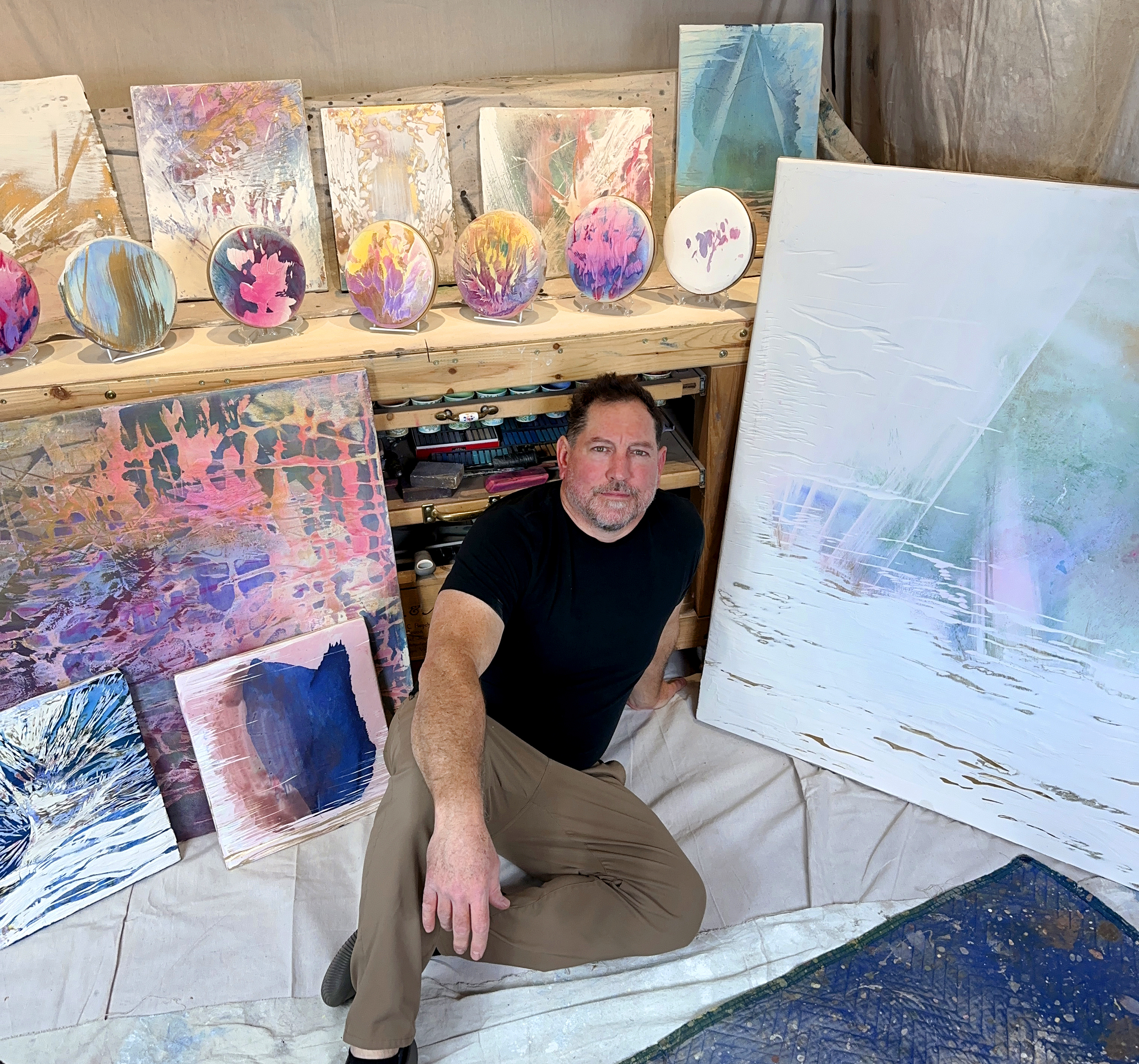Jose specializes in creating intuitive abstract paintings that act as portable ascension portals, transcending boundaries with vibrant energy. His expressive paintings are distinguished by bold marks, fluid forms, vibrant pastel hues, and embellished with pure 24k metallic gold powders.